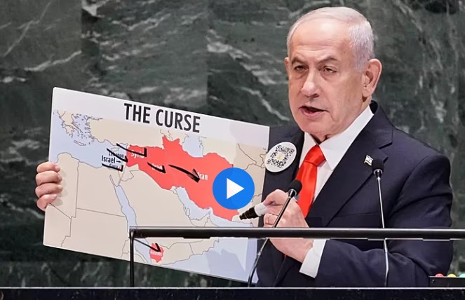Нетаньяху также продемонстрировал карту, на которой изображено то, что он назвал "проклятой иранской осью террора", заявив, что большая часть прокси-структур Тегерана была уничтожена израильскими военными.