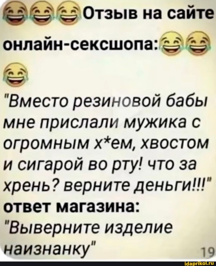 Мне жена по инету заказала кроссовки 43-го размера. Пришли 37-го размера, замшевые и на каблуке. Хорошо, что хоть жене подошли…