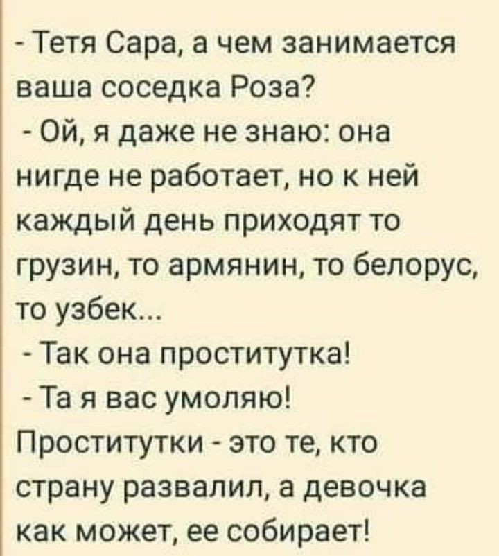 — Здравствуйте, Роза Львовна! — Здравствуй, Ада Борисовна! Ви куда такая нарядная? — Таки на работу! — Хм! — Понимаете, у меня все соседи — пенсионеры. Так уж пусть они и дальше думают, шо я таки падшая женщина, чем узнают, шо я терапевт...