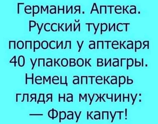 Мужик у ларька делает заказ: — Бутылку водки, две шампанского, коробку конфет. Да, и пачку презервативов.: — К сожалению, презервативов нет: — Тогда ничего не нужно.
