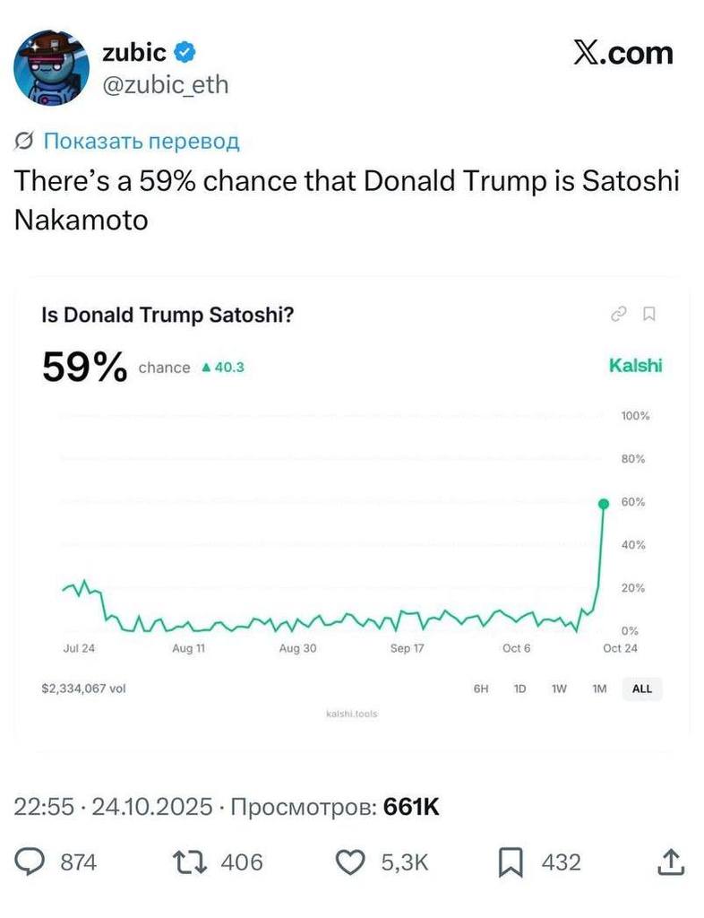 Стало быть, г-н Трамп и есть настоящий создатель биткоина. Так заявил нынче основатель криптобиржи Binance Чанпэн Чжао. Тем временем букмекеры начали принимать ставки на это с вероятностью 59%. См картинки.
