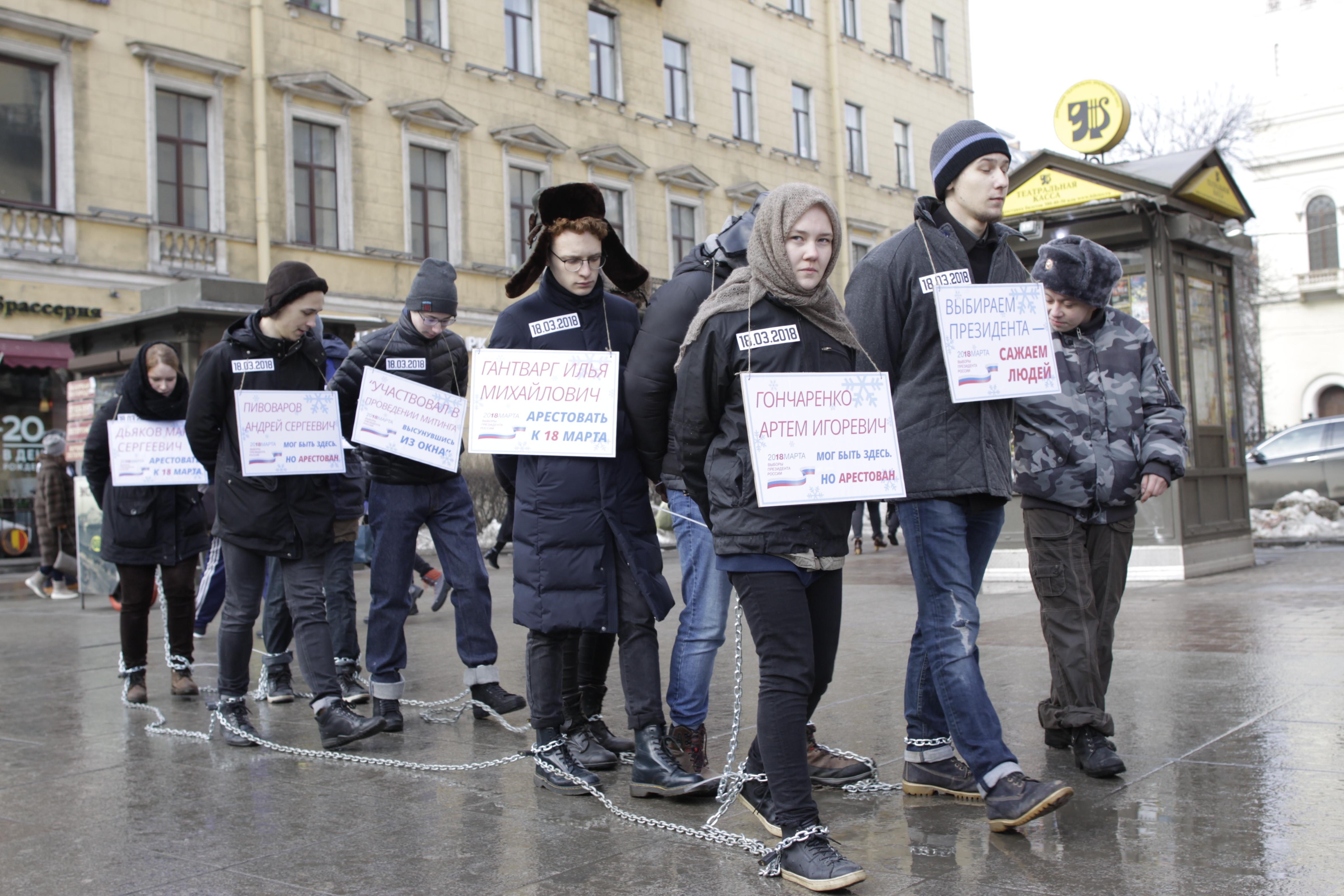 «Скованные одной цепью», в ватниках, ушанках и с номерами на груди активисты прошли от Малой Конюшенной по Невскому проспекту, а затем завернули на набережную канала Грибоедова. «Левой! Левой! Раз! Два! Три!» – командовал их «конвоир». «А цепи-то почему? Типа, пока Путин – президент, мы все в цепях?» – спросил один из прохожих. Многочисленные туристы охотно фотографировали арестантов. На фоне открыточных видов Петербурга их цепи и ватники выглядели особенно выразительно. Активисты заметили подозрительную активность полицейских в районе мероприятия, но обошлось без задержаний.