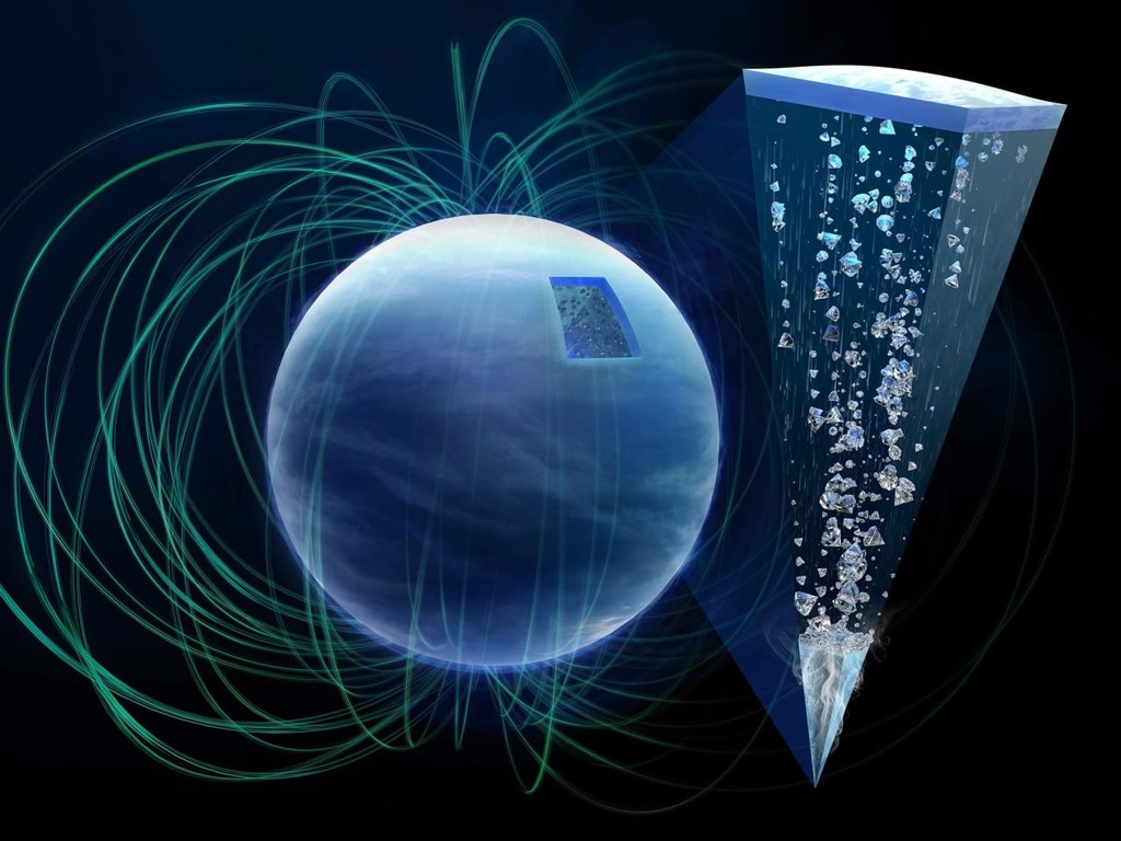 Сформировавшиеся куски алмазов падают дождем вниз, в направлении ядра, где углерод расплавляется и, подобно водяным парам на Земле, снова поднимается вверх, повторяя цикл.