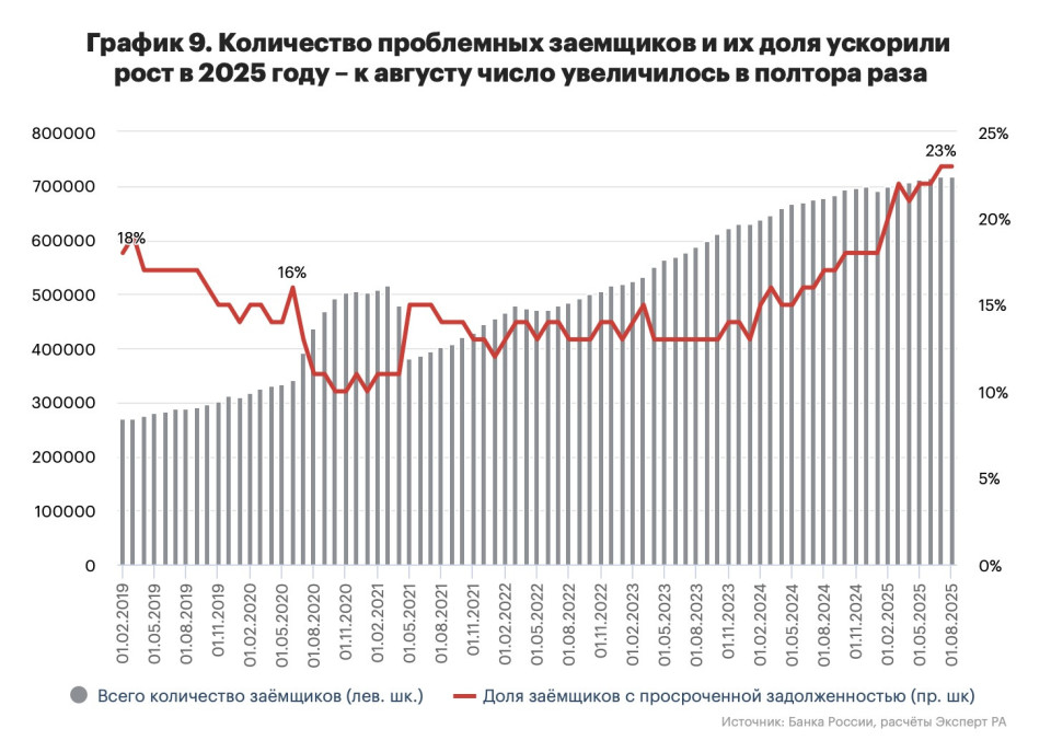 Доля проблемных заемщиков среди юридических лиц по состоянию на август 2025 года достигла 23% и стала рекордной за 6 лет доступной статистики, следует из данных рейтингового агентства «Эксперт РА».