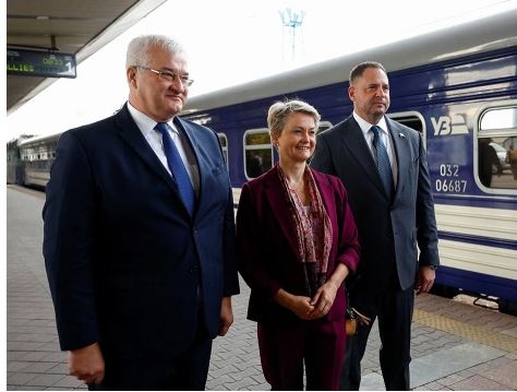 Глава офиса украинского президента также опубликовал видео с железнодорожного вокзала, где вместе с министром иностранных дел Украины Андреем Сибигой встретил иностранных коллег.