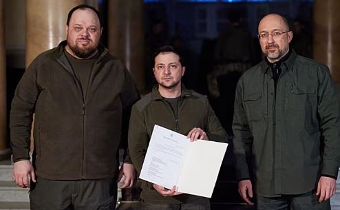 На следующее утро президент Зеленский потряс европейский истеблишмент, подав заявку Украины на вступление в Европейский Союз, что было отмечено ставшей уже культовой фотографией подписи в бункере под осажденным зданием украинского президентства.