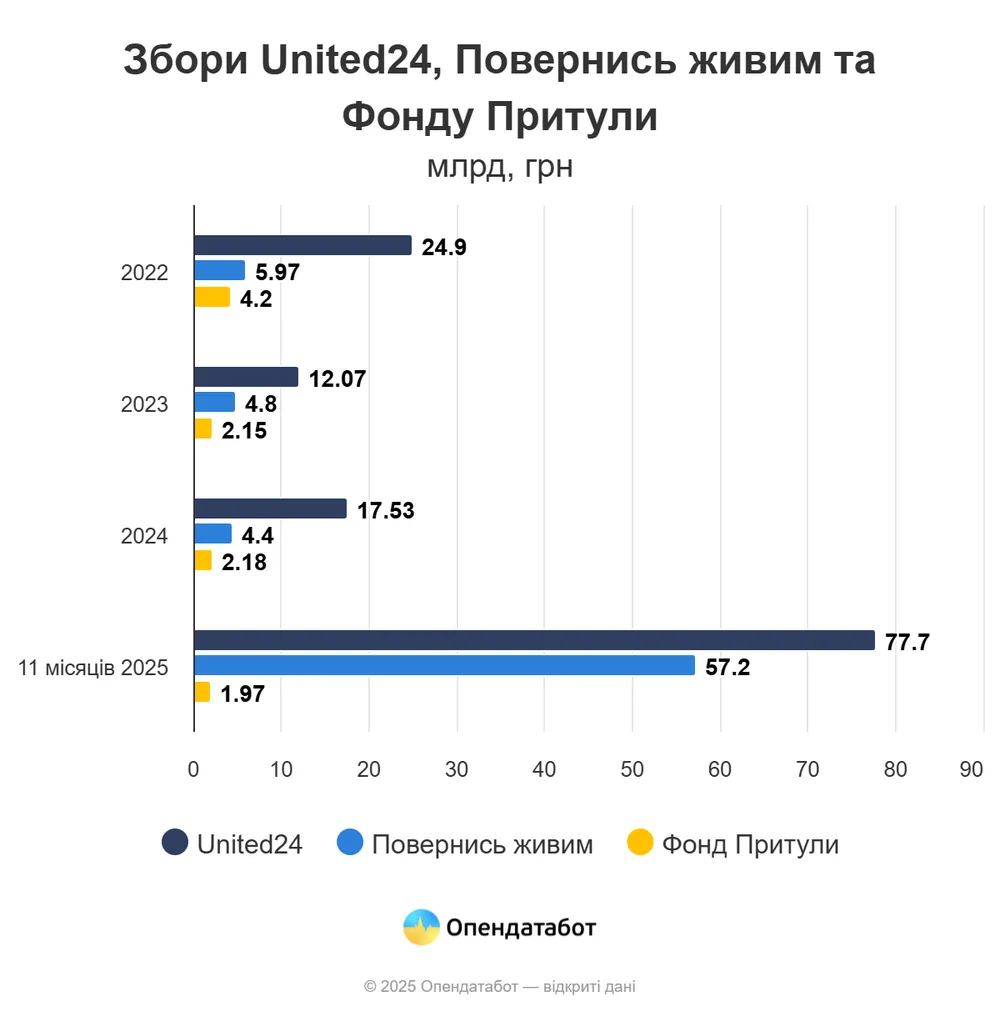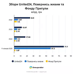 Крупнейшие фонды Украины – United24, "Повернись живим" и Фонд Притулы – собрали 105,87 млрд грн пожертвований в 2025 году, что на 37% больше, чем за три предыдущих года вместе взятых. 73% из этой суммы (77,7 млрд грн) приходится на United24. Из них 1% было направлено на гуманитарные цели, остальное – на нужды ВСУ.